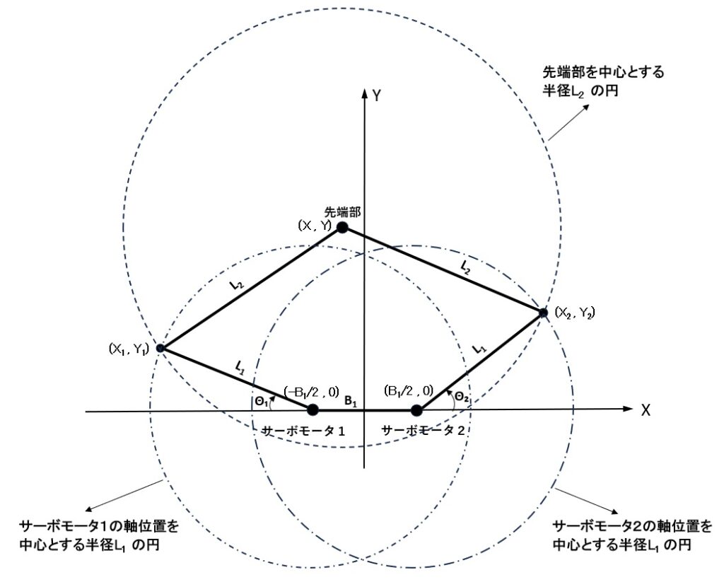 ①先端部の座標値(X, Y)を中心とした半径L2の円と、サーボモータ1の軸位置の座標値(-B1/2, 0)を中心とした半径L1の円の2個の交点を求め、その内X座標値が小さい方がリンク部分の座標なので、それを(X1, Y1)とします。