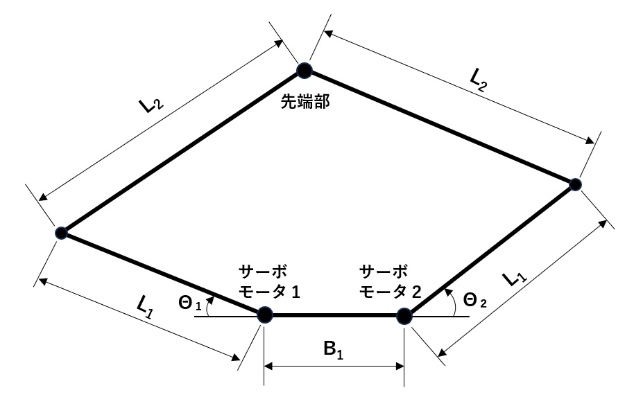 2個のサーボモータ軸間の長さをB1、サーボモータに接続される最初のアームの長さがL1、次のアームの長さがL2です。