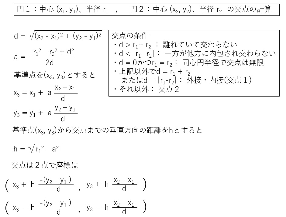 尚、2個の円の交わる点の座標は以下の様に計算することができます。