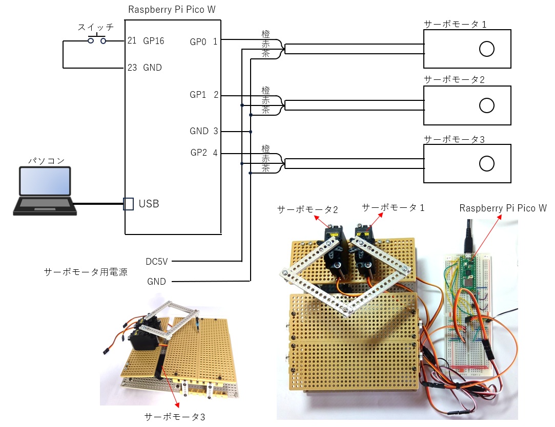 は、Raspberry Pi Pico WのI/OのGP0~GP2に各サーボモータのPWM信号を割り当てています。PWM周波数50Hzに設定しています。