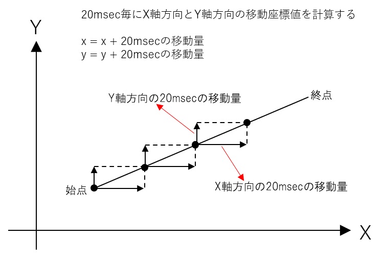 20msec毎のロボットの先端部分の座標値の計算は、現在のロボット先端部のX,Yの現在座標値に、それぞれ予め計算した20msecの間の移動量を足し算することによって求めています。(図10)